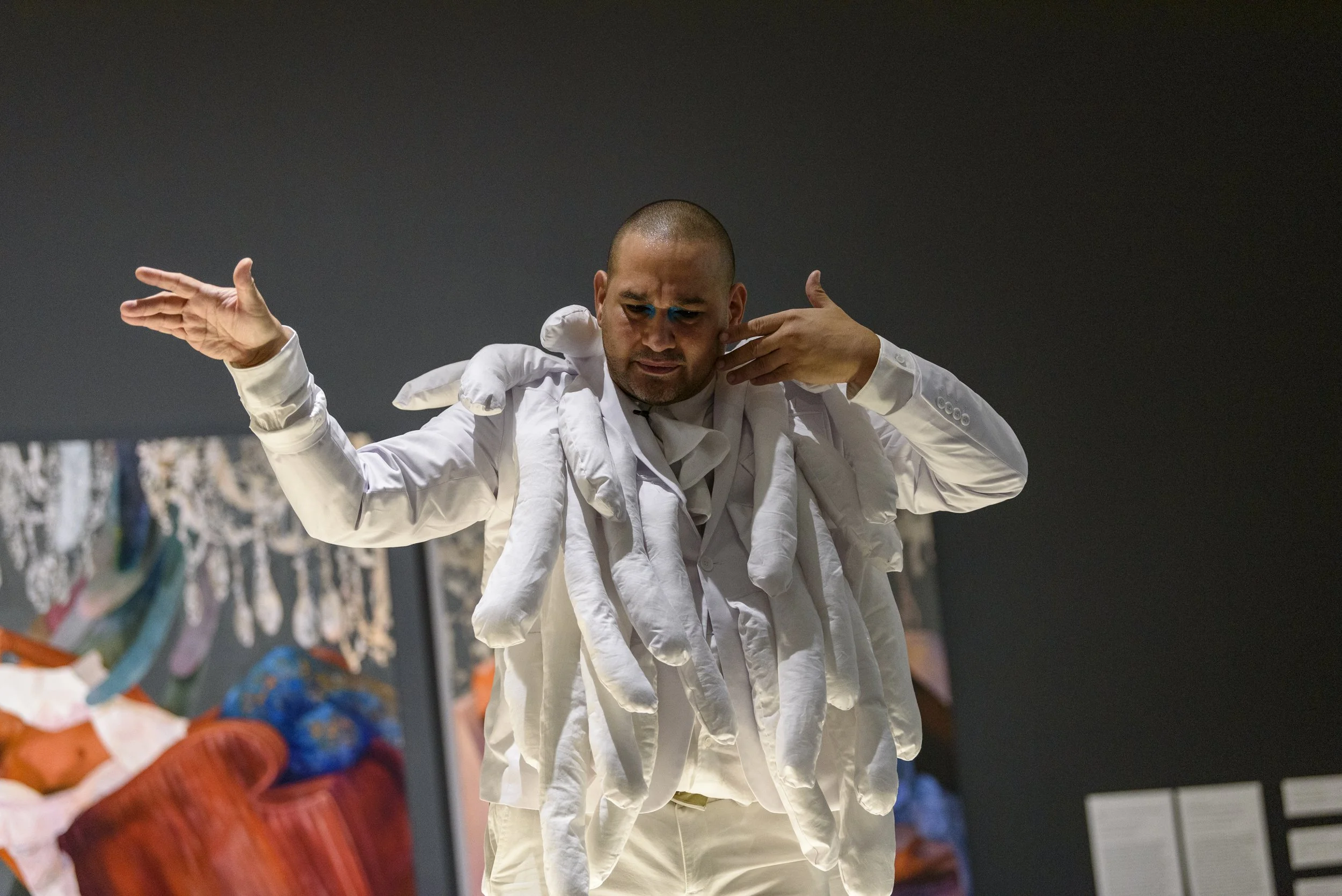 The opera-like performances are a loud psychological manifestation of the portraits frozen in the paintings. The performers are often the model sources for the paintings. Like the paintings, the performances explore the physical, emotional, and metaphorical disjunction between the body, society, and structures.